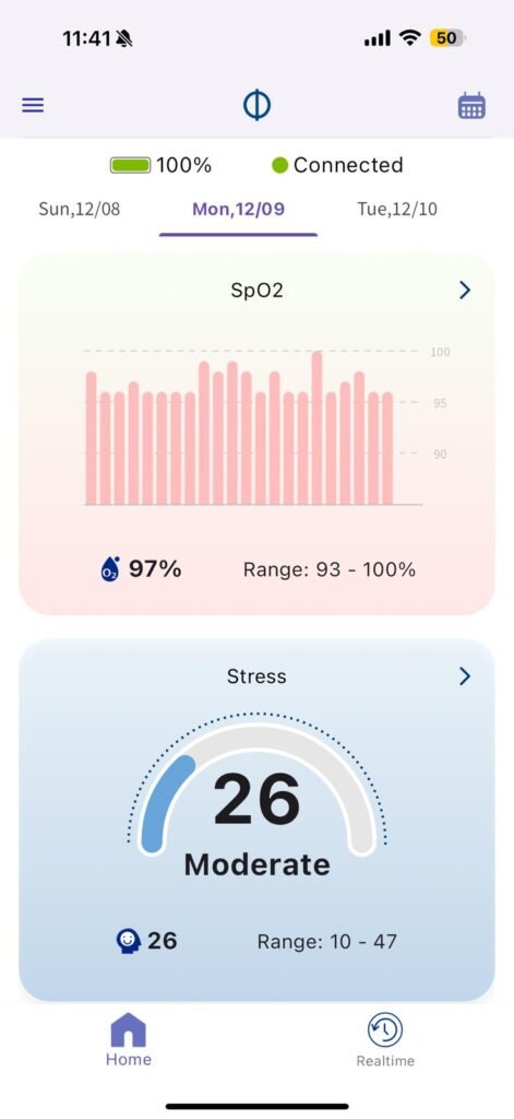 The Medfy-Ring tracks blood oxygen index (SpO₂) and stress in a single screen for easy tracking.