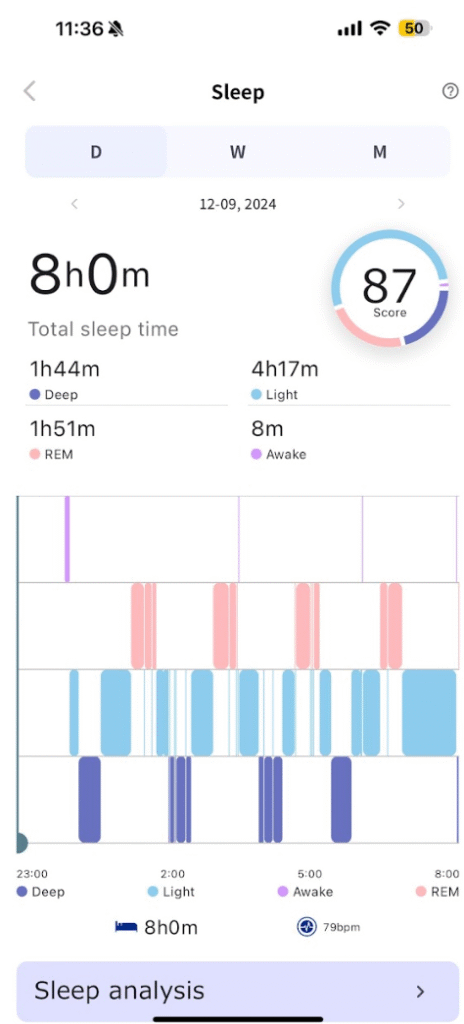 This is a sleep analysis ring, and it does more than track your sleeping patterns. It offers comprehensive sleep analysis, breaking down your night into light, deep, and REM sleep stages. It calculates a sleep score (0–100) so you can measure progress over time, with daily, weekly, and monthly views.