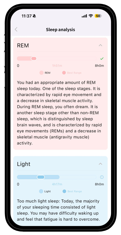 If your deep sleep is low, it may suggest earlier bedtimes or evening wind-down routines. If stress is spiking at night, it may encourage breathing exercises or lighter evening meals. The guidance adapts to your habits, making improvements realistic and sustainable.