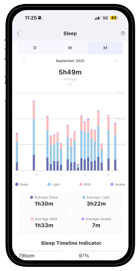Compare months to see how lifestyle changes affect your rest, and use the sleep analysis ring to track progress over time.